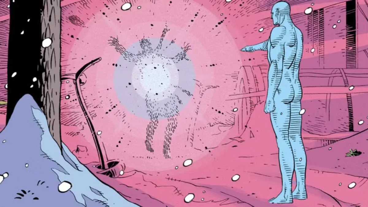 The moment is stark and unadorned. Far from celebration, Rorschach stands in the frozen quiet of Antarctica as the world prepares to cross into a new year built on survival rather than truth. Midnight is imminent elsewhere, marked by fireworks, relief, and belief that catastrophe has been averted. Here, there is only a decision waiting.