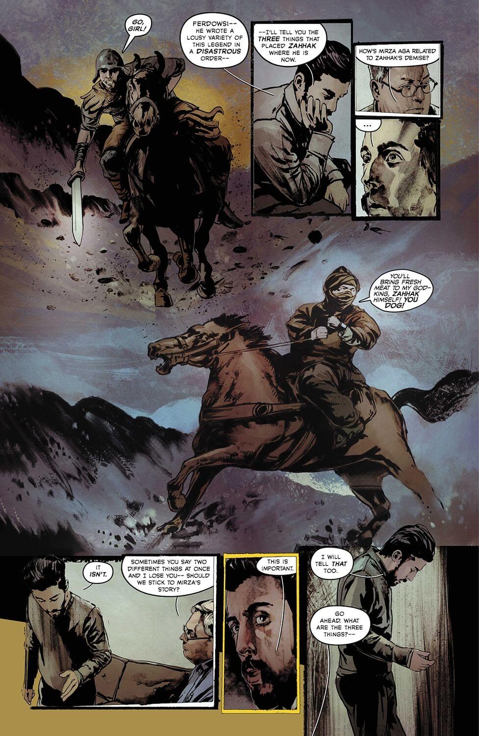 Huge in scope and concept, with numerous shocking, heavy, and visceral moments, I, Tyrant is an intricately woven, character focused narrative. It’s a story about stories. The mythology and lore is deep and complex, tackling the figure of ancient Arab serpent-king Zahhak — a figure rarely covered in fiction, so it was instantly fascinating to see Zahhak in a comic setting.