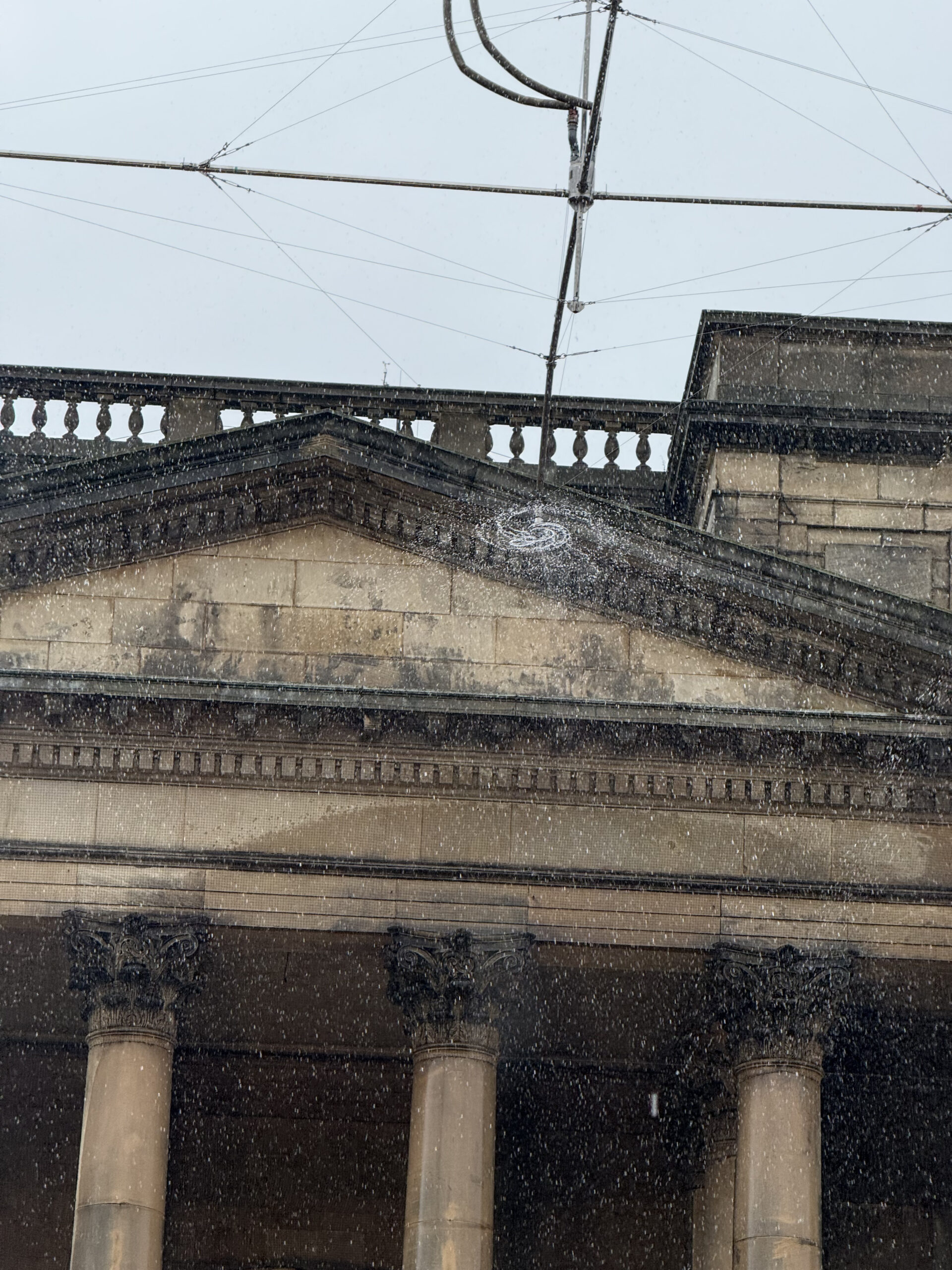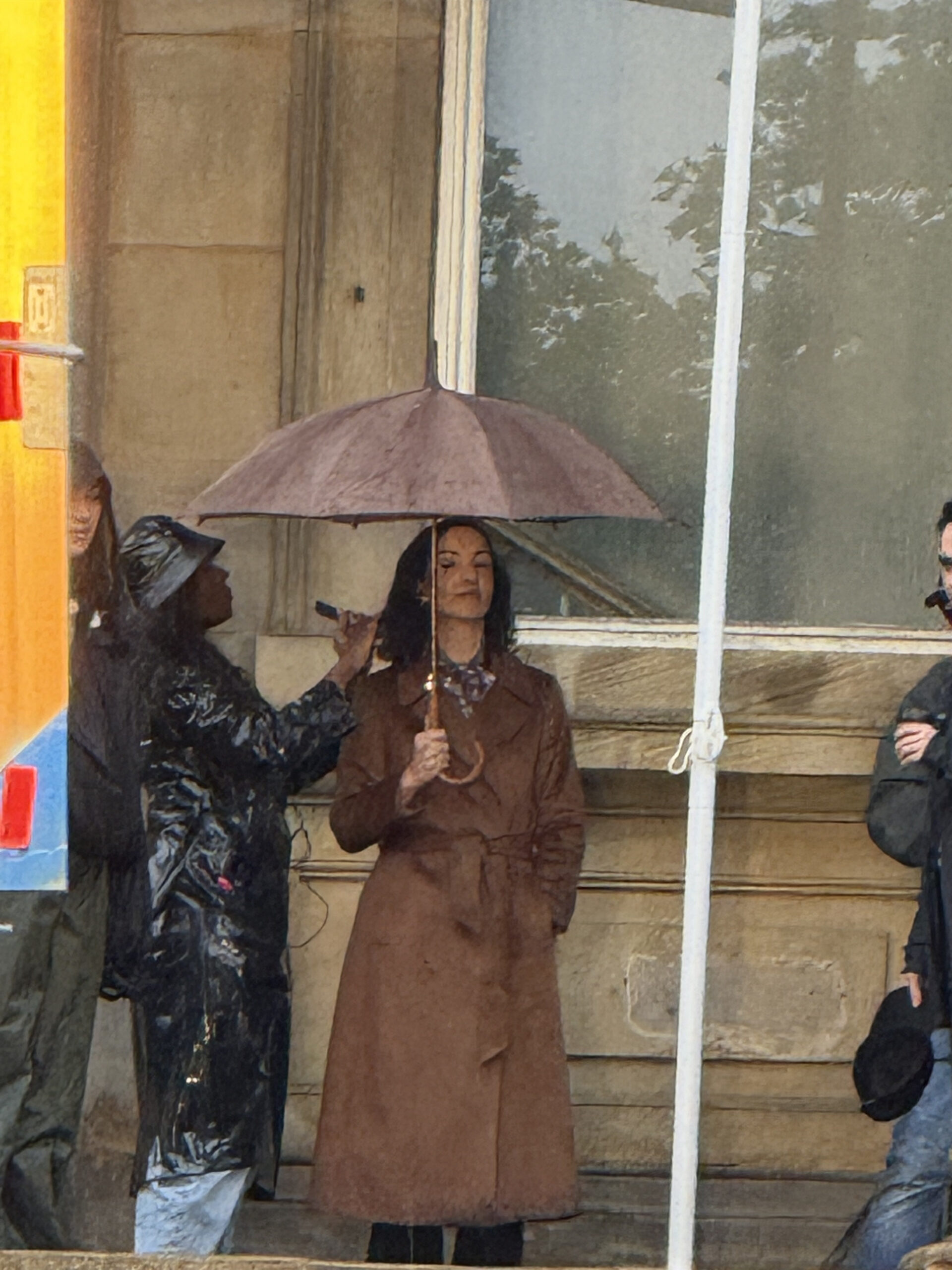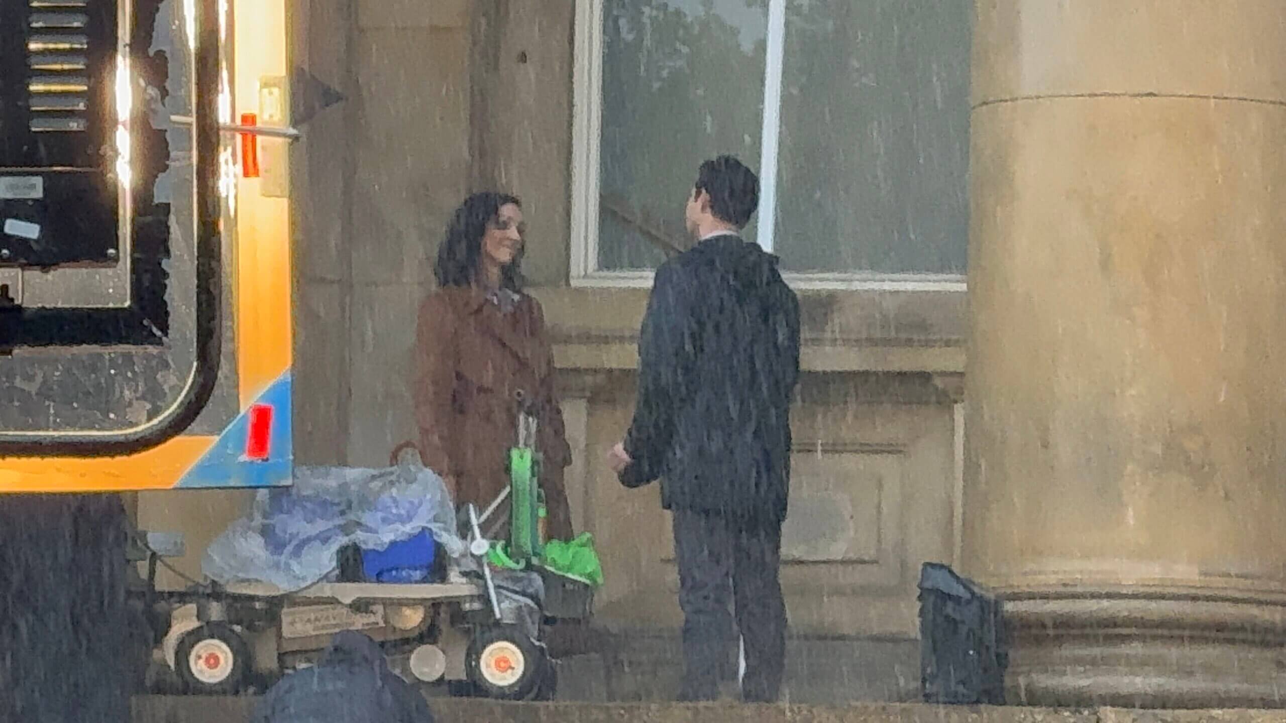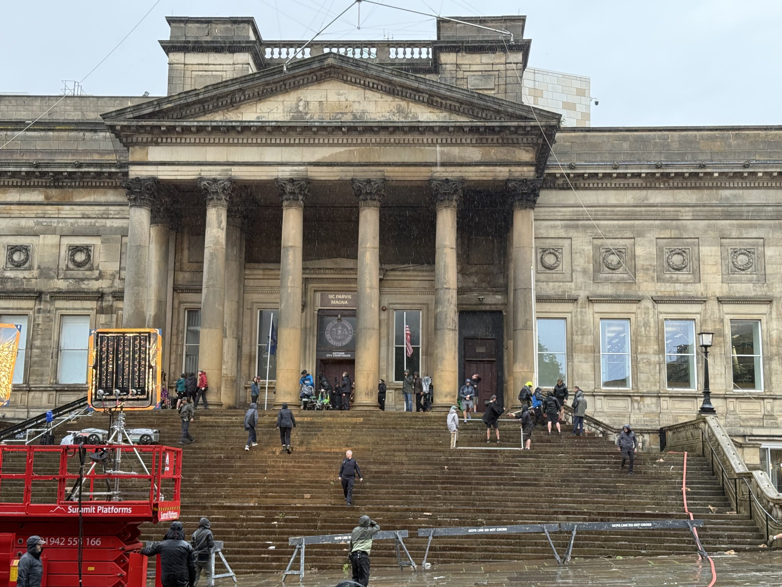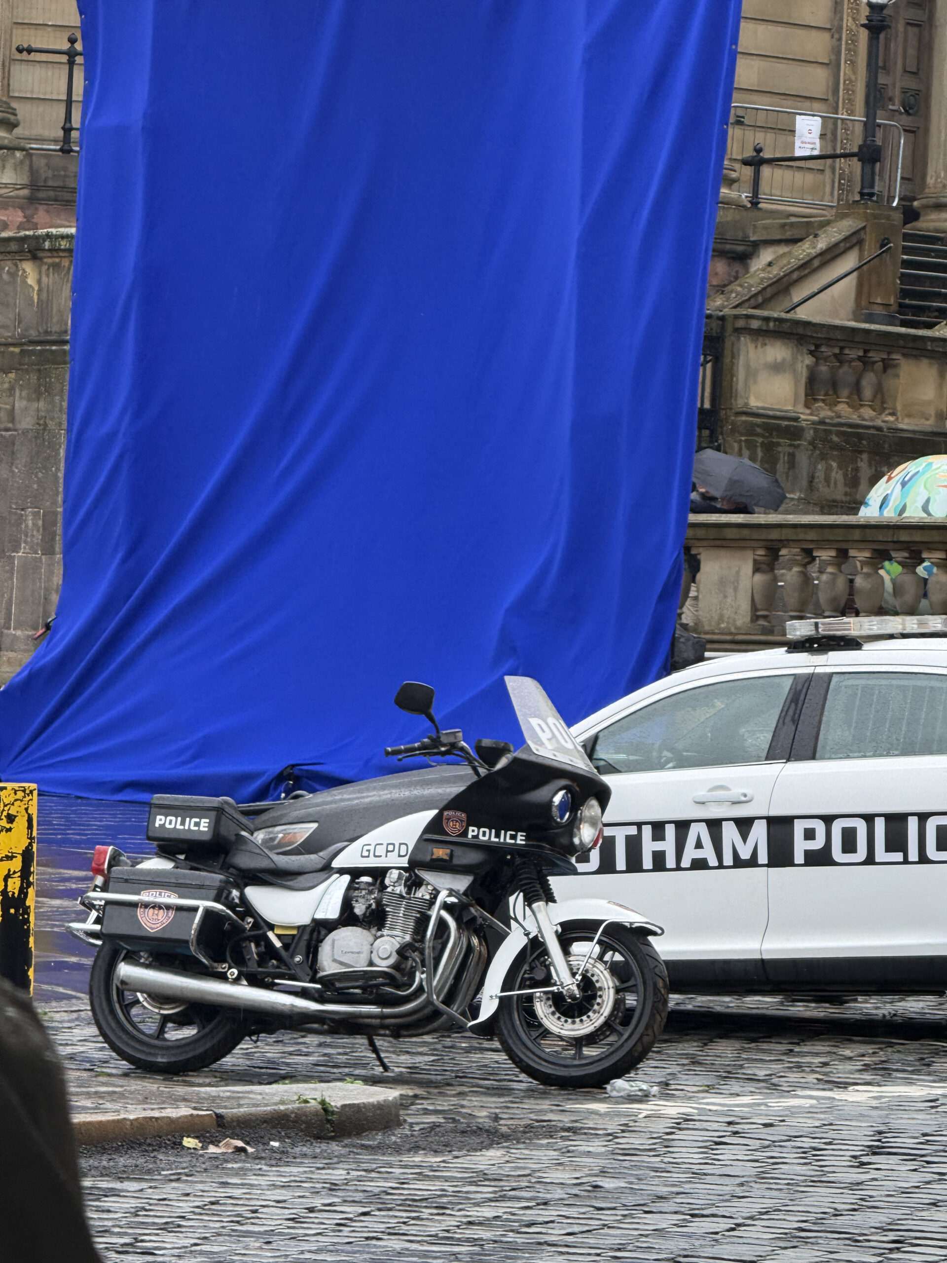 As the movie has entered filming, the city of Liverpool, England, has once again been transformed into Gotham City. Of course, Matt Reeves’ The Batman was also partly filmed in the city. We’re based in Liverpool, so as to not miss an opportunity, we headed into to the city centre to see what was going down. On an already rainy day, with added rain from the filming team for effect, we saw star Max Minghella outside Gotham’s courthouse. This movie marks the first time that we’ll see Gotham in Gunn and Safran’s continuity.