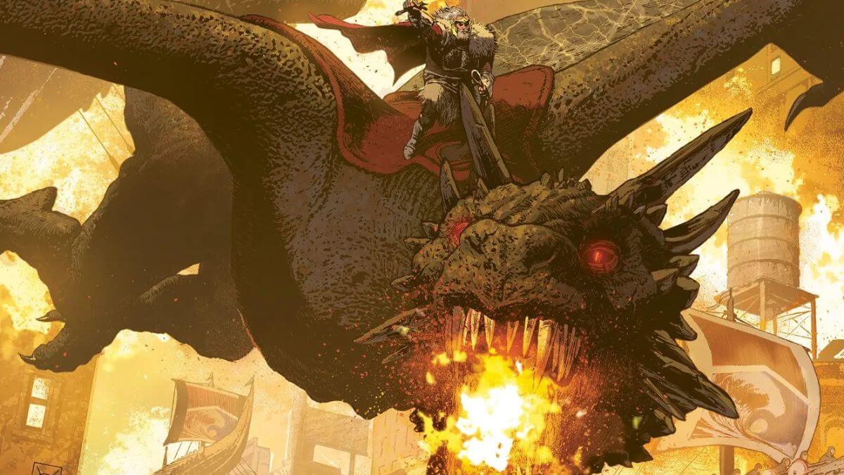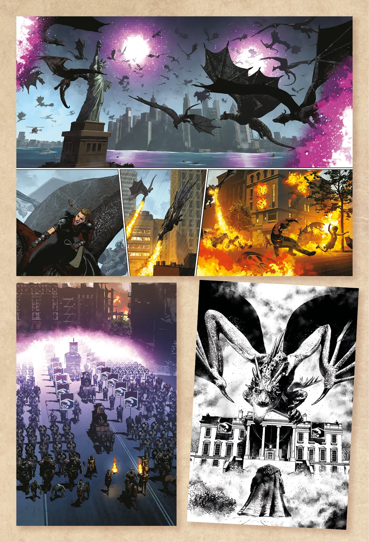 “It’s the basic idea of Independence Day meets Game of Thrones,” Millar explained in an announcement video. “The idea of a portal opening up in the middle of New York City, and dragons, barbarians, all these hordes coming in … and wiping out America, just taking the country down. And they’ve got their eyes on the rest of the world.”
