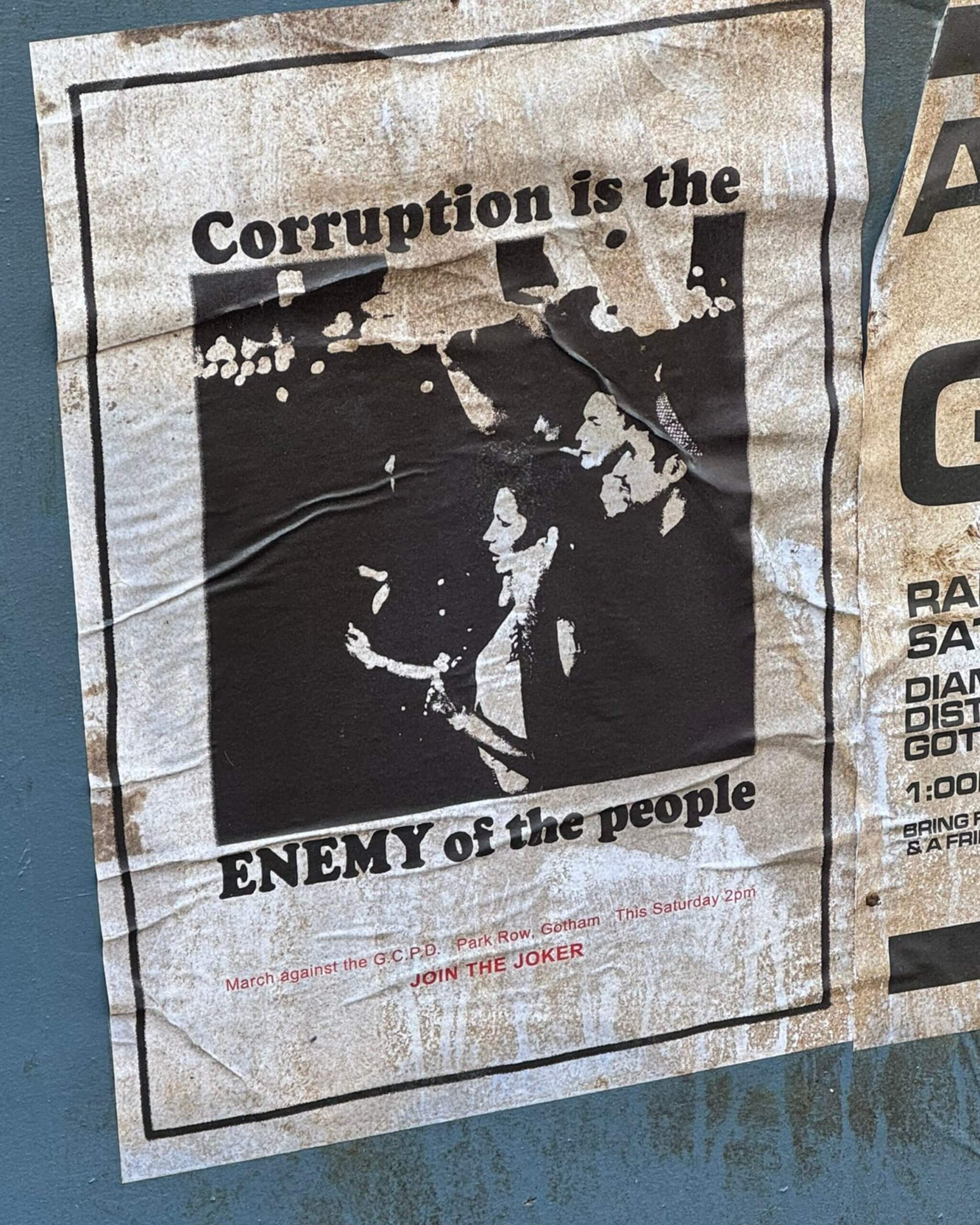 They captured a photograph of a poster. “Corruption is the enemy of the people,” it reads. The poster advertises a march against the Gotham City Police Department — organised by none other than the Joker. Is this confirmation that he’s in the movie? Not in the slightest. But it’s certainly food for thought, and an interesting glimpse of what the Joker is up to in Gotham at the time the movie is set. Take a look: