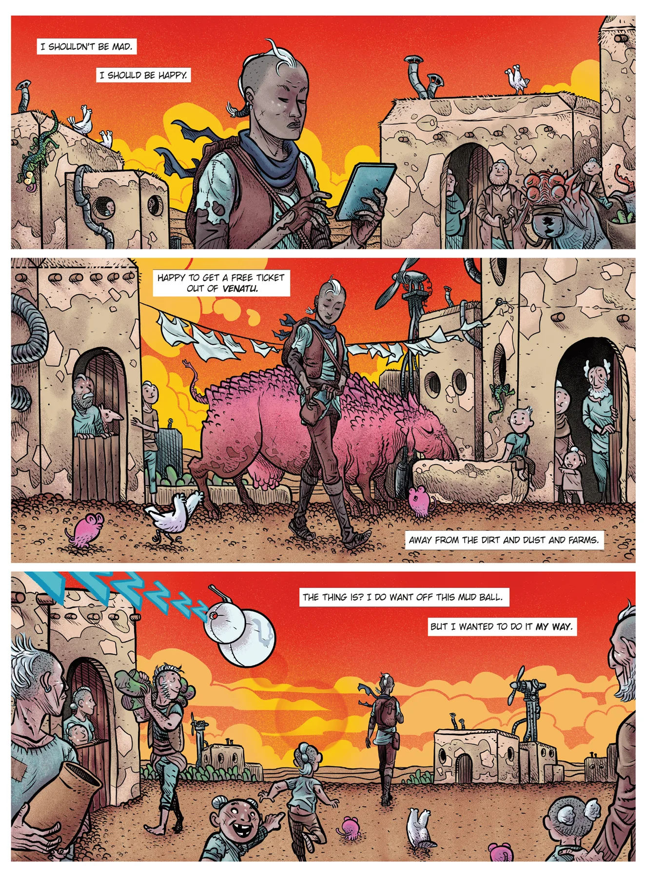 Our main character Ember of Venatu is well-developed and fun to read. She’s far from a hopeful young girl. Her cheeky and cynical outlook is refreshing for the genre, and it shows in the decisions she makes throughout issue #1.
