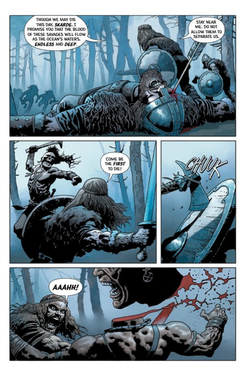 Frusin added: “From the very first moment Joe told me about ‘Viking Moon,’ I was fascinated by the combination of Vikings and werewolves, an epic and terrifying universe that offered me infinite visual possibilities. Joe’s talent for handling these elements and crafting a captivating story moment by moment has impressed me from the start. As Joe develops the script, every decision he makes seems perfect to me and leaves me with a constant desire to know how the story will continue. I hope you all enjoy the comic as much as I enjoy drawing it!”